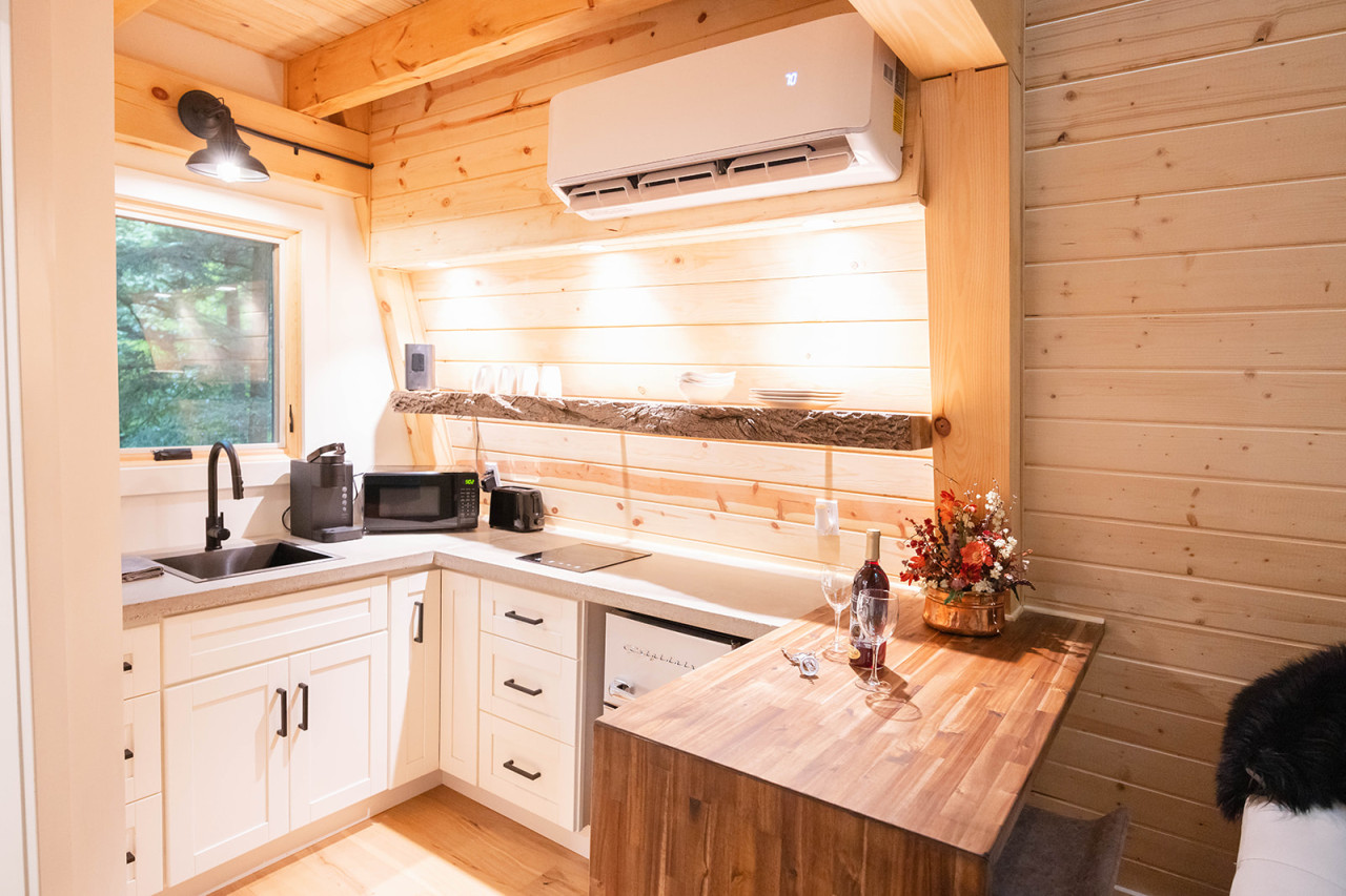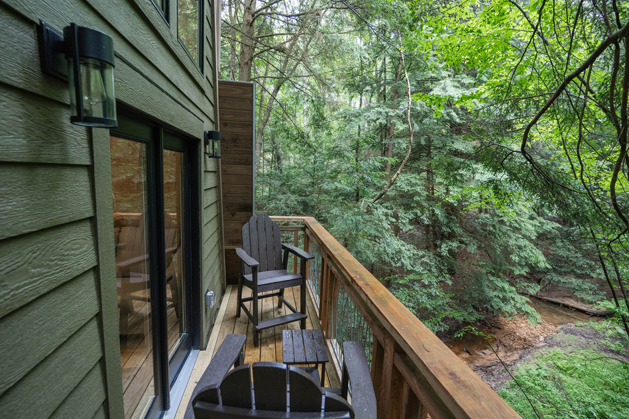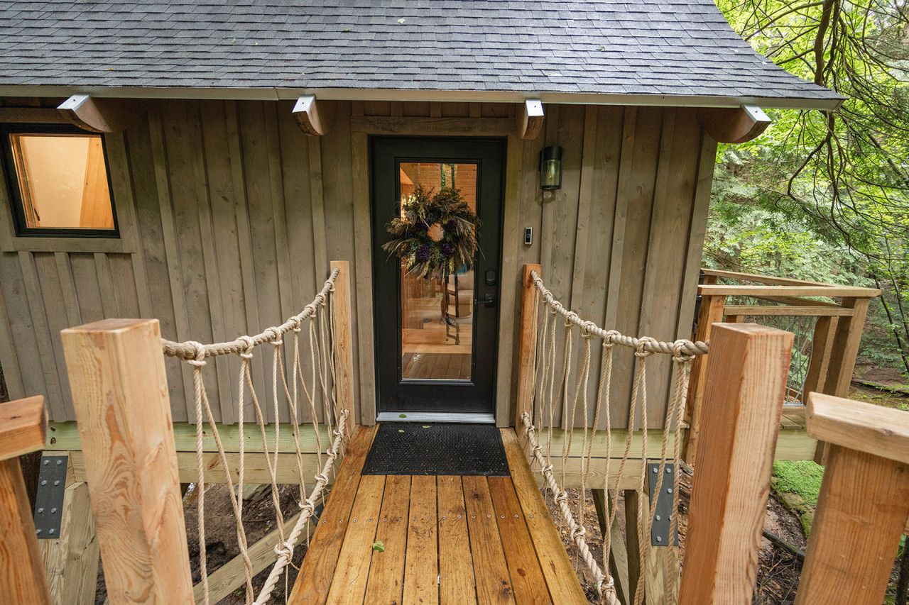 Welcome to the epitome of rustic elegance: our luxury treehouse retreat, delicately perched among the whispering hemlocks, where a crystal-clear creek meanders beneath your feet. Tucked away in a serene woodland setting, this remarkable treehouse is designed to envelop you in the tranquil beauty of nature, creating an experience that is nothing short of magical. Upon crossing a charming wooden bridge, you'll find yourself in an architectural marvel, suspended above the gentle flow of the creek. The treehouse seamlessly blends into its surroundings, creating a harmonious marriage between natural aesthetics and modern comfort. Inside, the open-plan living space is adorned with large windows that frame the enchanting forest views, allowing dappled sunlight to fill the room. The interior is a masterful symphony of warm wood accents, providing an inviting and cozy atmosphere. Plush furnishings beckon you to relax, while a fireplace adds a touch of nostalgia and warmth. The kitchen boasts modern appliances and rustic charm, allowing you to prepare delectable meals to be savored on the spacious deck. The bedroom, designed with tranquility in mind, features a luxurious king-sized bed, dressed in the finest linens. Large windows and a private balcony provide an intimate connection to the natural world, offering the soothing sounds of the creek and the rustling hemlocks as your lullaby. Outside, the expansive deck straddles the creek, inviting you to bask in the serenity of your surroundings. The deck also features a cozy seating area, perfect for sipping a glass of wine and watching the world go by. For the adventurous souls, our luxury treehouse offers direct access to the natural wonders of the forest, where you can simply bask in the serene ambiance. Unwind with a good book or enjoy the company of your loved one in this romantic and secluded haven. This luxury treehouse straddling a creek amongst hemlocks offers a unique opportunity to reconnect with nature in a luxurious and enchanting setting. Whether you seek a romantic getaway or a peaceful retreat, this elevated experience promises a one-of-a-kind escape into the heart of the forest, where the symphony of the creek and the embrace of the hemlocks create an unforgettable backdrop to your luxurious stay.